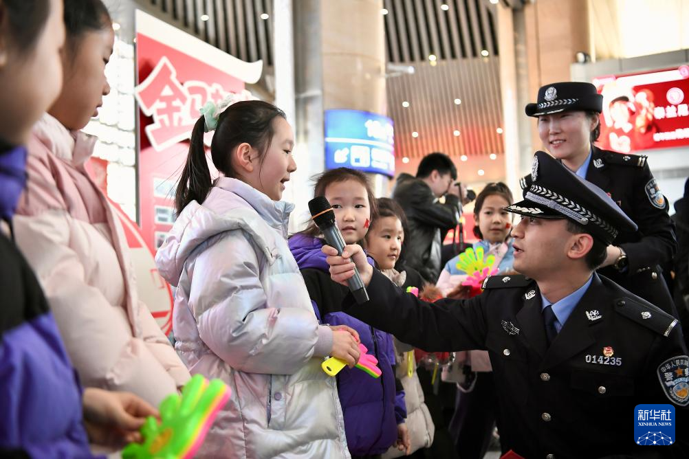 2月2日,在天津站候车厅,天津铁路公安处民警与旅客小朋友们互动。新华社记者 孙凡越 摄