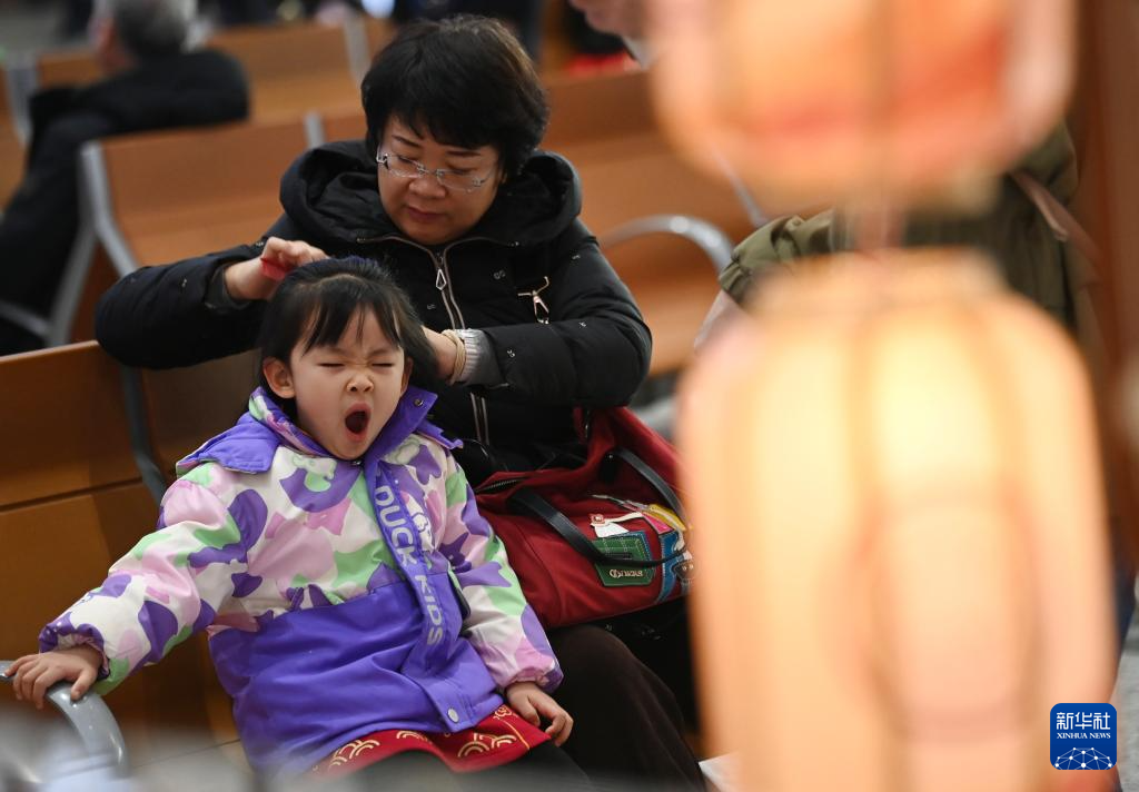 2月2日,在西安站候车大厅,一位旅客在候车期间为孩子梳头。新华社记者 李一博 摄