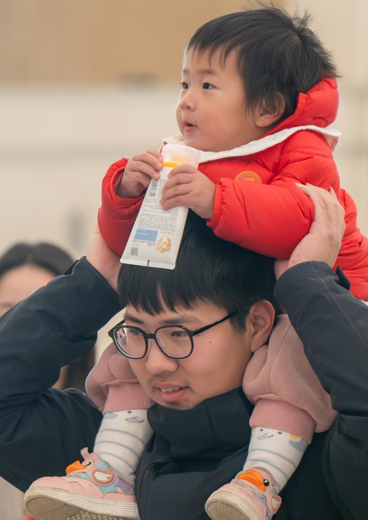 2月2日,在湖北武汉汉口火车站,一位父亲带着孩子在候车厅候车。新华社记者 杜子璇 摄