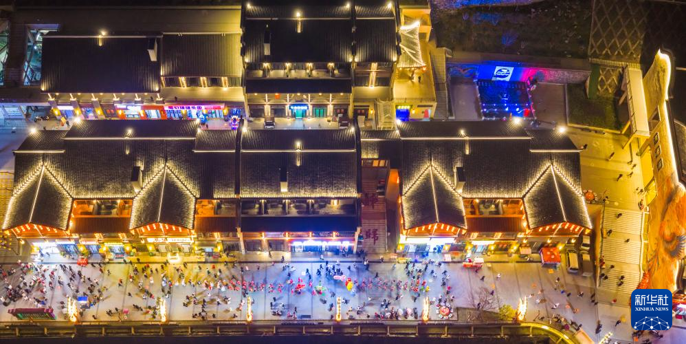 1月31日晚,湖北省宜昌市秭归县非遗传承人在九歌巷子举行龙狮巡游(无人机照片)。新华社发(郑家裕摄)