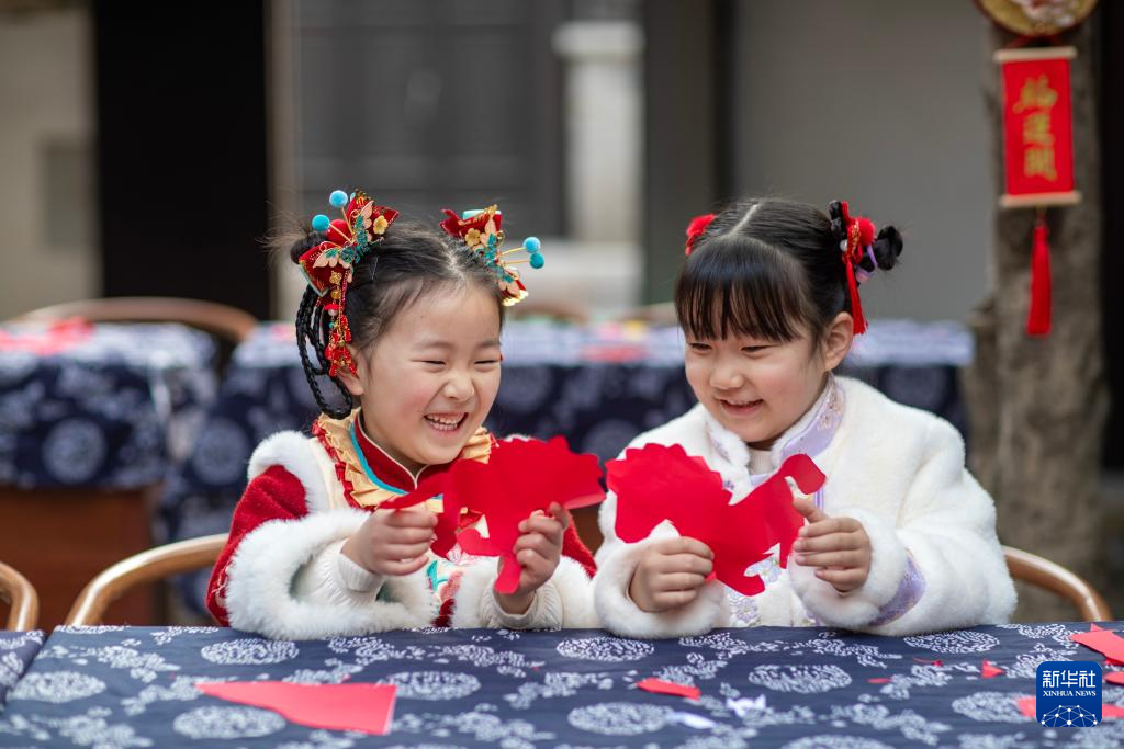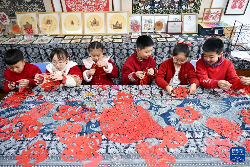 2月2日,在江苏省兴化市昭阳街道的毕飞宇工作室内,兴化市昭阳湖幼儿园的孩子们在老师的指导下创作以生肖马为主题的剪纸。新华社发(周社根摄)