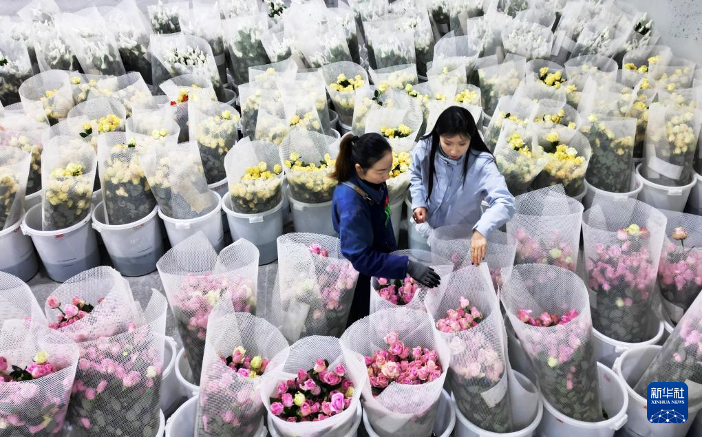 2月1日,在甘肃省临夏市枹罕镇的亿农国际鲜花港保鲜冷藏室内,工人在整理鲜花,供应节日市场。新华社发(史有东摄)