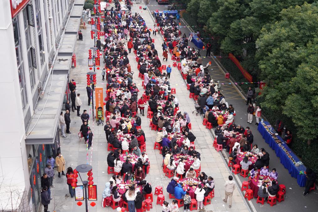 2月3日,湖北省武汉市经济技术开发区沌口街道永济社区居民品尝百家宴。新华社发(赵军摄)