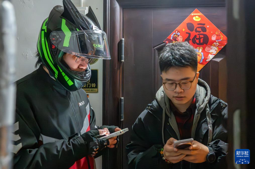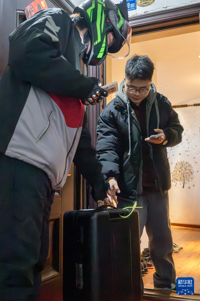 2月2日,在湖北武汉江岸区,程燚(右)与快递员确认行李信息。新华社记者 杜子璇 摄