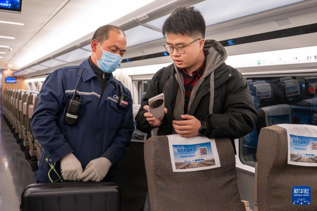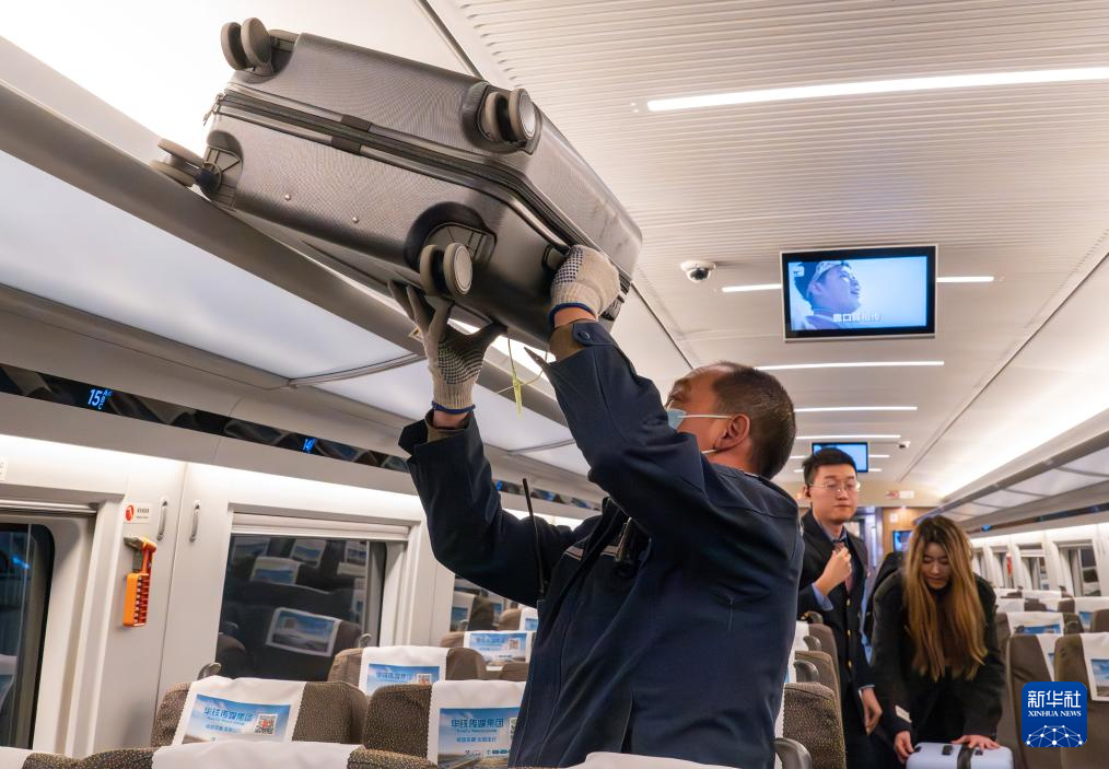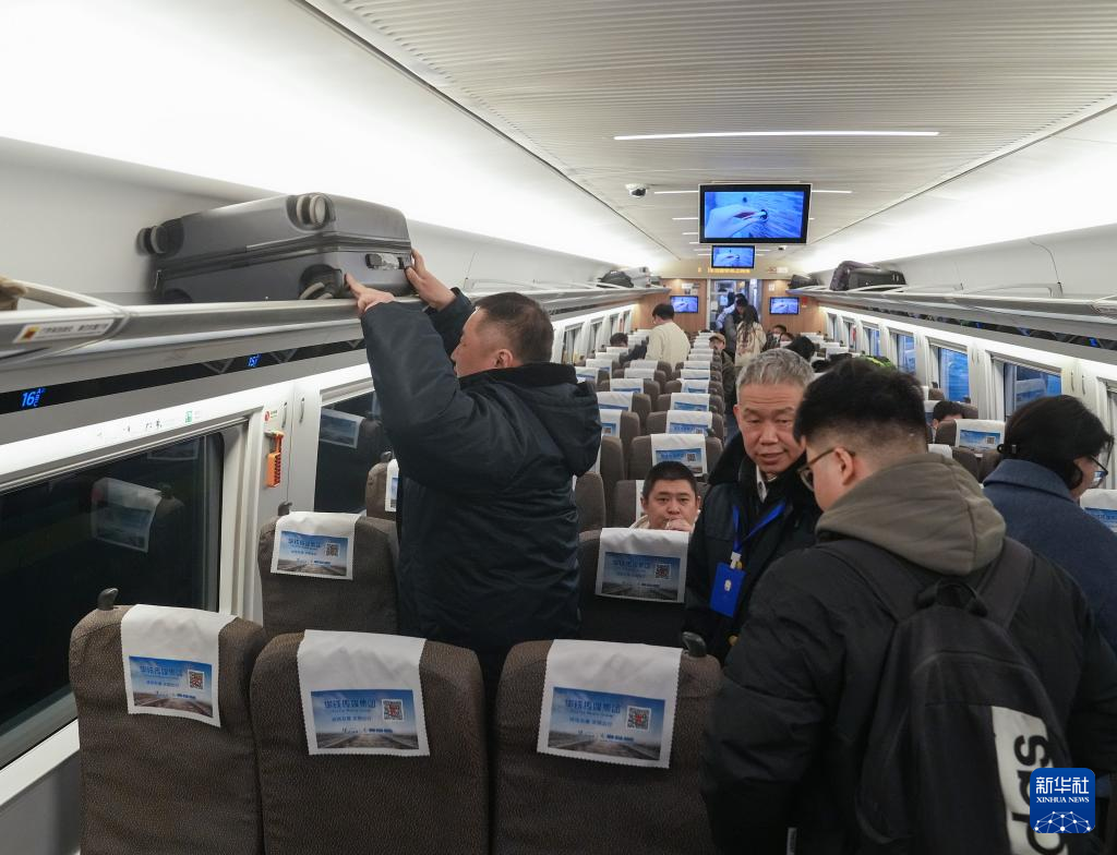 2月2日,铁路“轻装行”的工作人员将程燚的行李放置在车厢内的行李架上。新华社记者 丁汀 摄
