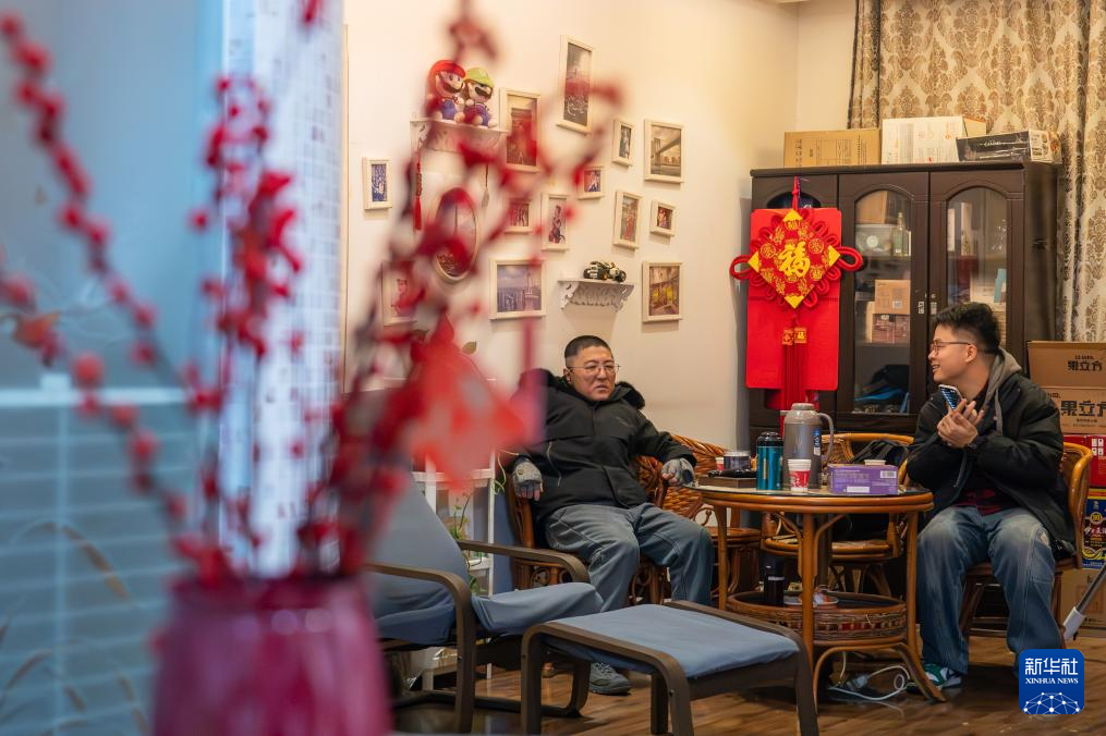 2月2日,在湖北武汉江岸区,程燚(右)与家人聊天。新华社记者 杜子璇 摄