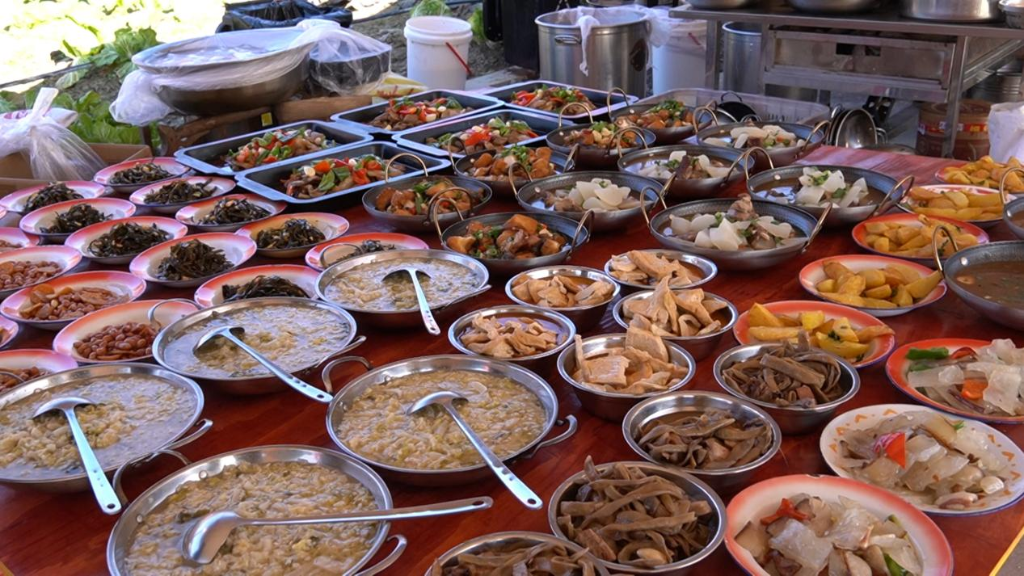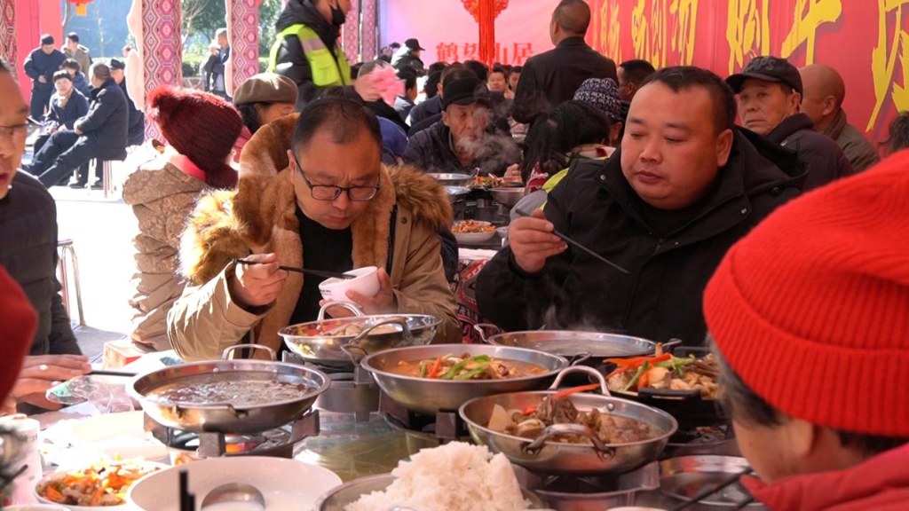 经验丰富的屠夫黄思兵俯身按住猪身,干脆利落,一系列动作行云流水。另一边,灶台边的火苗正旺,大锅里的水渐渐沸腾,冒着滚滚白雾。村民们围在灶台旁忙碌,有条不紊地准备客人们的餐食。鲜嫩的“头刀菜”、爽滑的“猪血块”、清甜的“排骨萝卜汤”陆续出锅。“每年杀年猪,来的人特别多,现做的菜招待来宾,今天准备了30多桌。”大厨申国兵一边炒菜,一边说道。