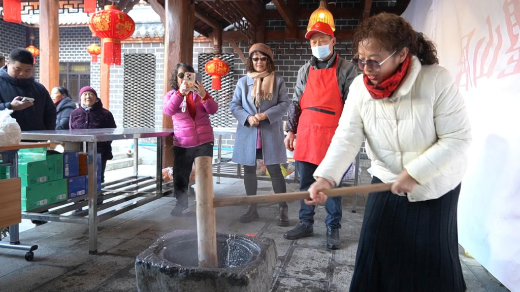 除了宴席上的美味,院角的石磨旁也围满了游客。浙江游客张秀兰和朋友上前,一人抱着磨杆慢慢转动,一人顺着磨眼往里面添黄豆和清水,乳白色的豆汁顺着石缝缓缓渗出,滴落在下方的陶盆里,带着淡淡的豆香。“时隔几十年了,我找回了儿时的记忆。”张秀兰说。