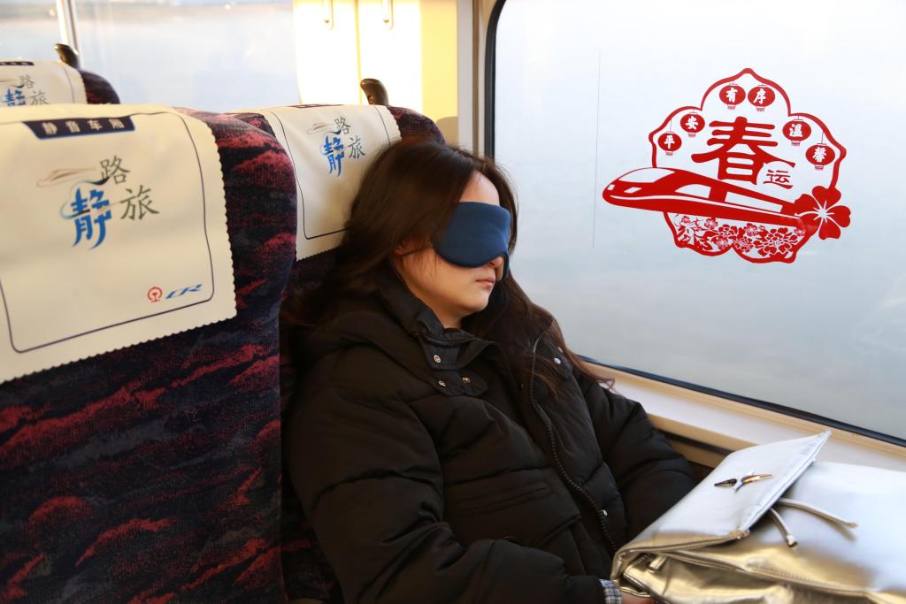 2月6日,旅客在D8696次列车静音车厢内休息。新华社发(薛莹莹摄)