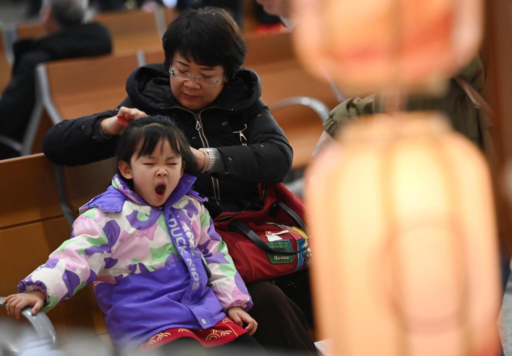 2月2日,在西安站候车大厅,旅客在候车期间为孩子梳头。新华社记者 李一博 摄这就是我们的春运——