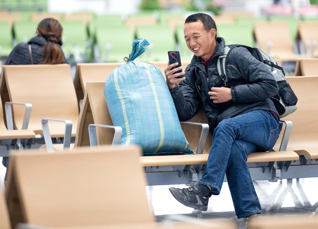2月2日,旅客在兰州火车站候车厅拍照留念。新华社发(侯崇慧摄)