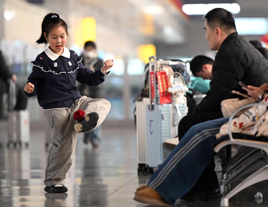2月2日,小朋友在郑州东站候车时踢沙包。新华社记者 李嘉南 摄