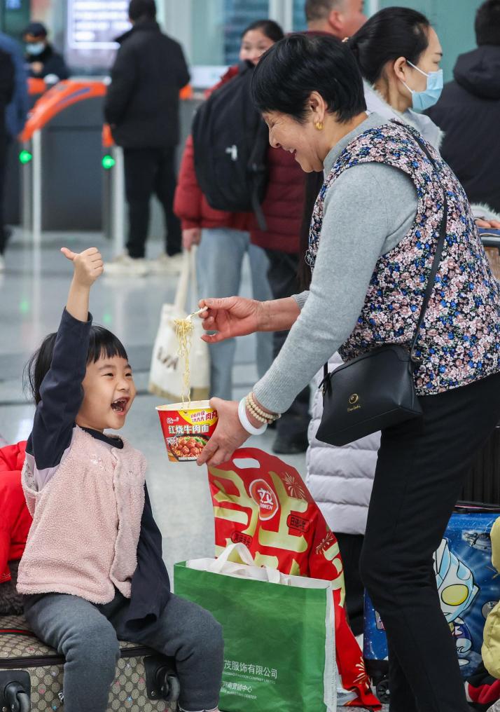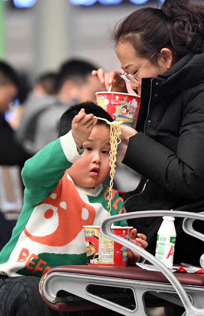2月2日,小朋友在郑州东站候车时吃泡面。新华社记者 李嘉南 摄