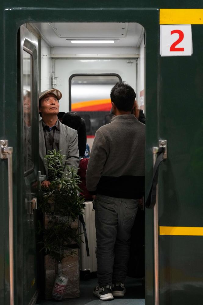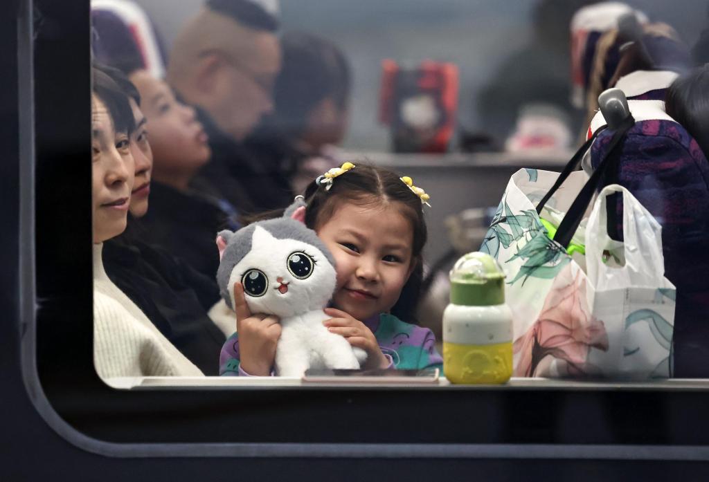 2月2日,搭乘2026年深圳地区春运首班车C7152次深圳北到岳阳东列车的乘客在车上照顾婴儿。新华社记者 毛思倩 摄车里车外