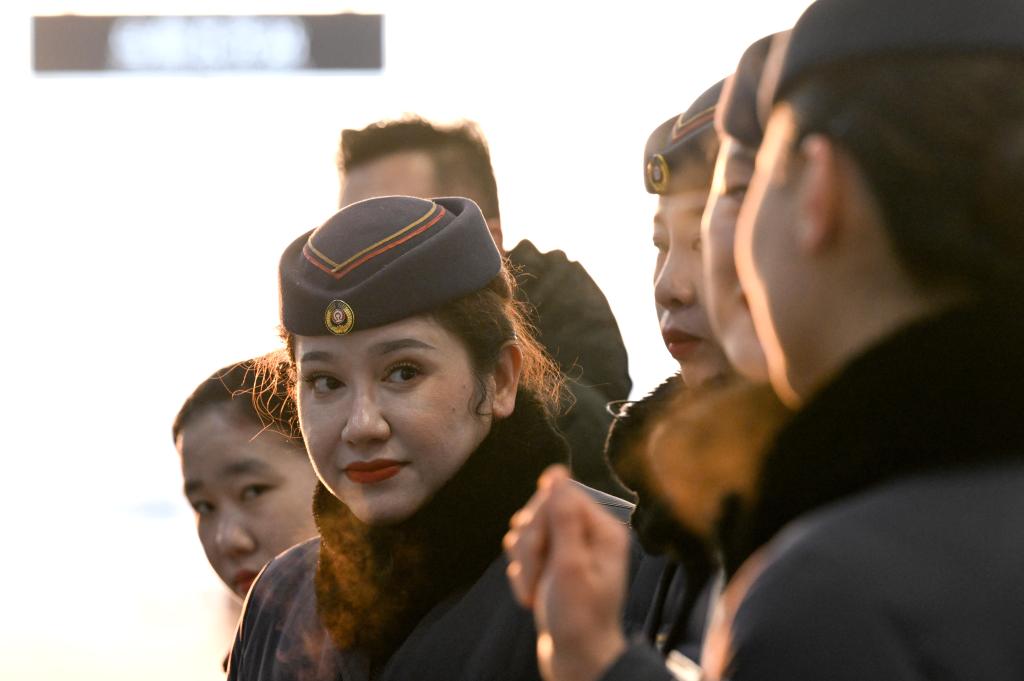 2月2日,在乌鲁木齐站,乘务人员在上车前进行工作交流。新华社记者 王菲 摄