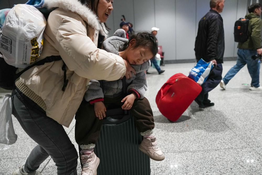 2月1日深夜,在广州白云站,乘坐2026年粤港澳大湾区首趟春运列车K4232次列车的旅客们在排队进站,小女孩坐在行李箱上睡着。新华社记者 吴鲁 摄
