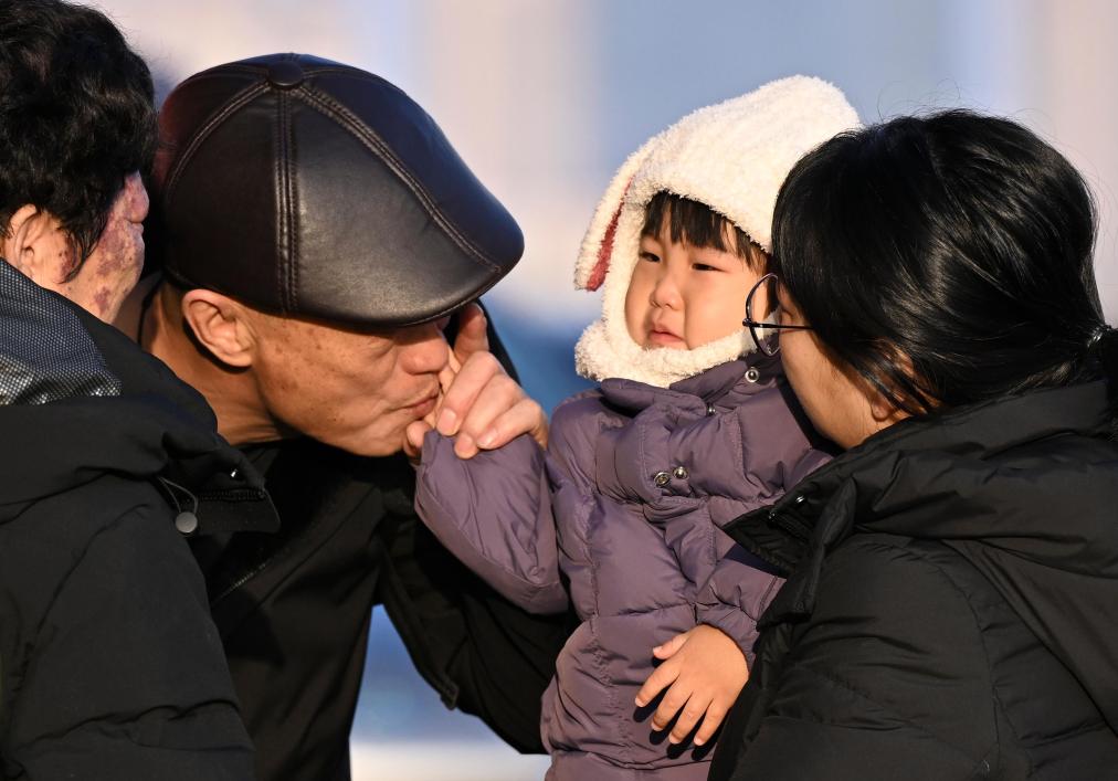 2月2日,在江苏海安站出站口,小朋友跑向前来接站的家人。新华社发(顾彬斌摄)
