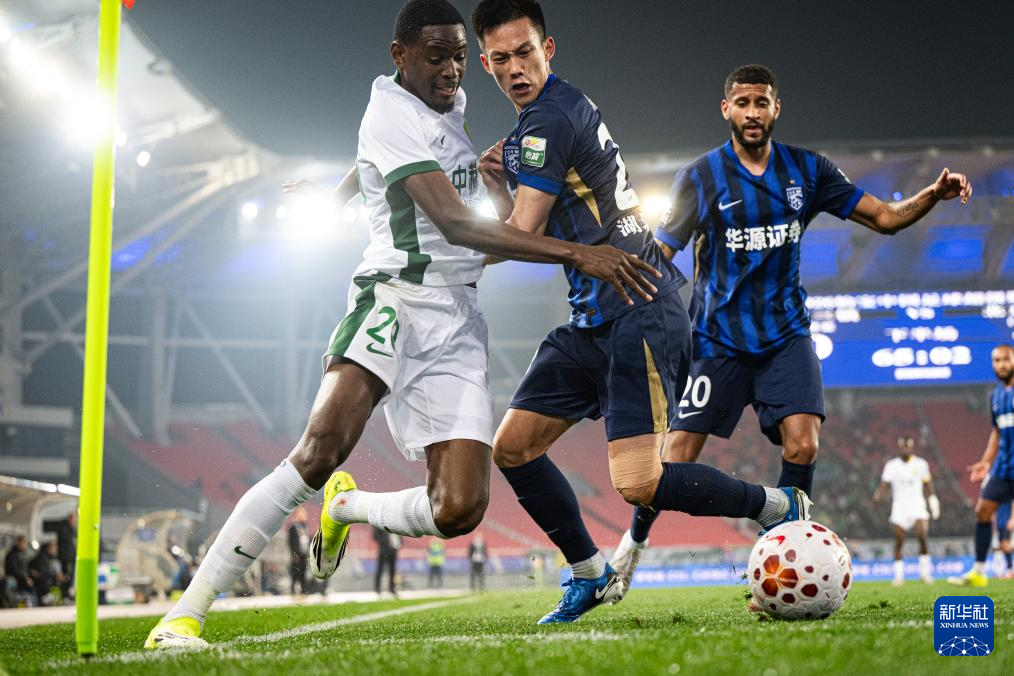 3月8日,武汉三镇队球员王毅(中)与北京国安队球员恩科洛洛在比赛中拼抢。新华社记者 肖艺九 摄