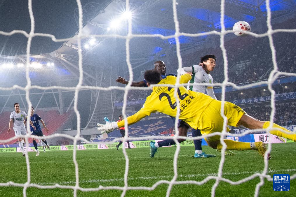 3月8日,武汉三镇队守门员方镜淇在比赛中扑救。新华社记者 肖艺九 摄