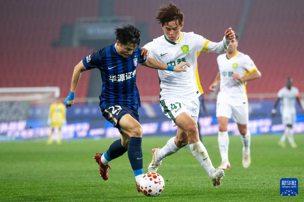 3月8日,武汉三镇队球员明天(左)与北京国安队球员邓捷夫在比赛中拼抢。新华社记者 肖艺九 摄