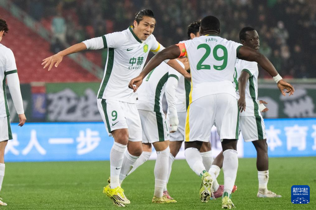 3月8日,北京国安队球员张玉宁(左一)进球后与队友庆祝。新华社记者 肖艺九 摄